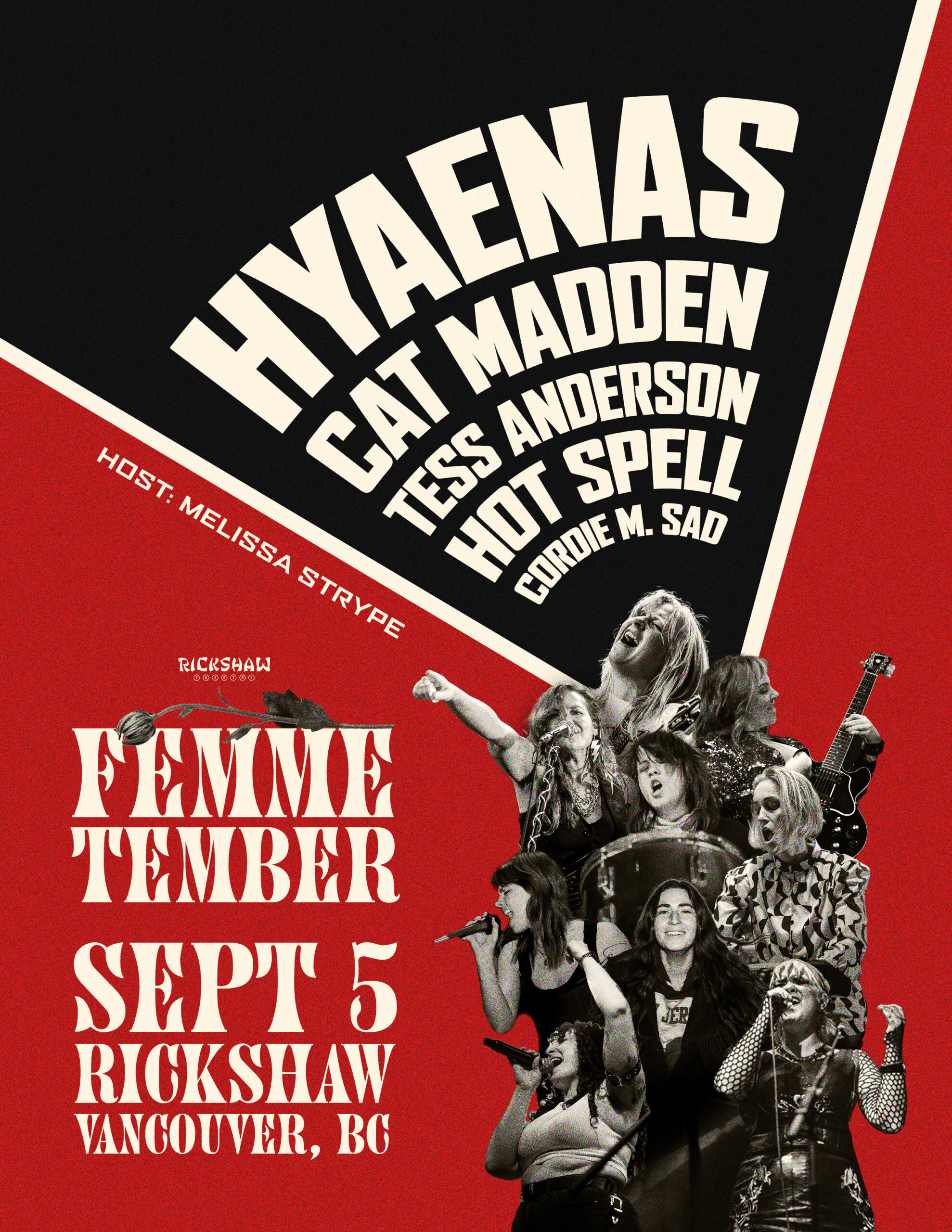Join us to celebrate women in music with some of Vancouver’s most talented femme-bands: Hyaenas, Cat Madden, Tess Anderson, Hot Spell, Cordie M.Sad, all hosted by LA’s beloved muso-comic Melissa Strype.
