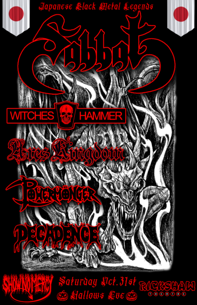 Making their Western Canadian debut are Japanese Black Metal Legends Sabbat all the way from the land of the rising sun! With direct support from Ares Kingdom (Kansas) Witches Hammer, Powermonger and Decadence!